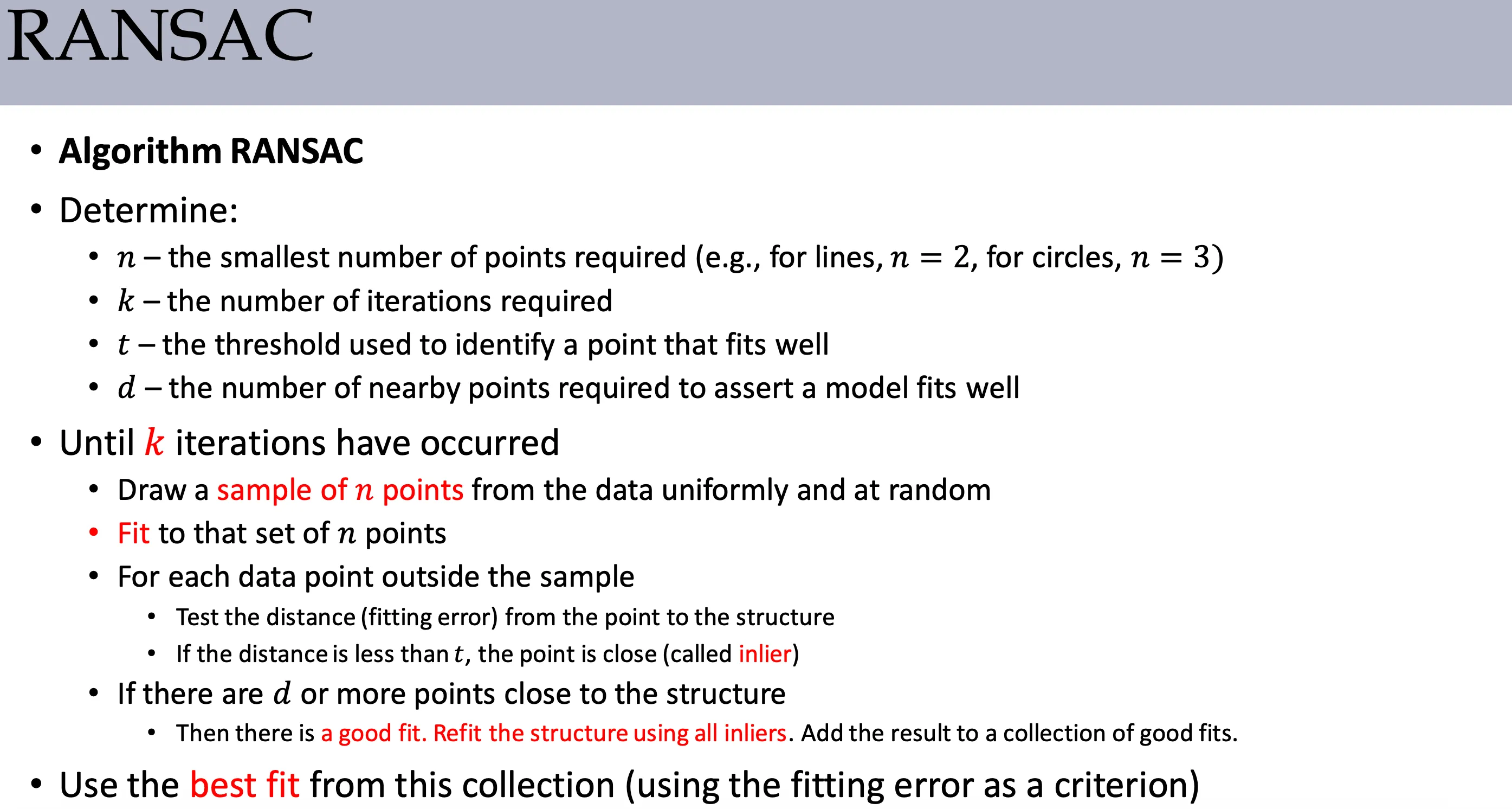 - 重复 1-4 步若干次,最后将“用最多内点估计出的参数”作为最终结果.
